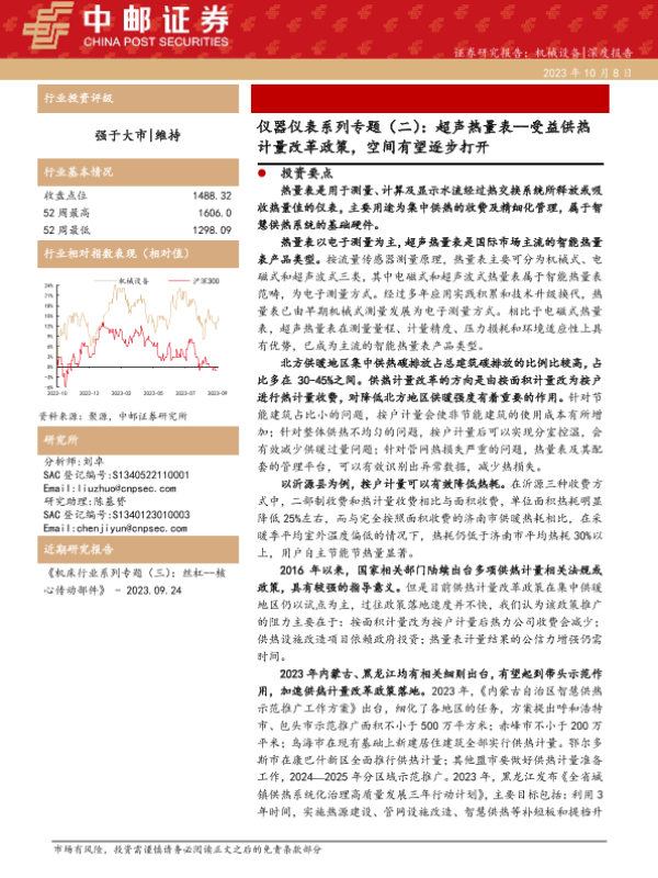 【中邮证券】【20231009】仪器仪表系列专题(二):超声热量表--受益供热计量改革政策-空间有望逐步打开-19页 行业研究