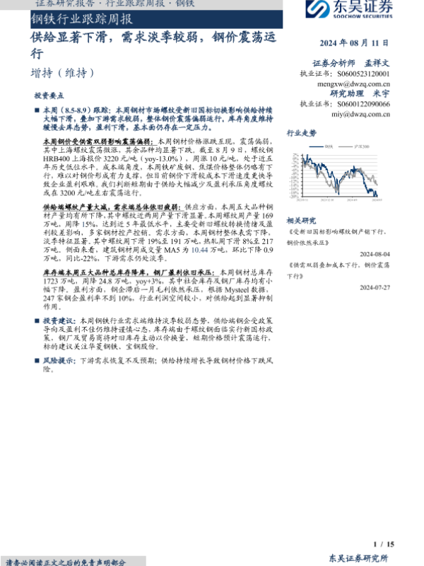 【东吴证券】【20240811】20240811-东吴证券-钢铁行业跟踪周报:供给显著下滑,需求淡季较弱,钢价震荡运行-15页 行业研究