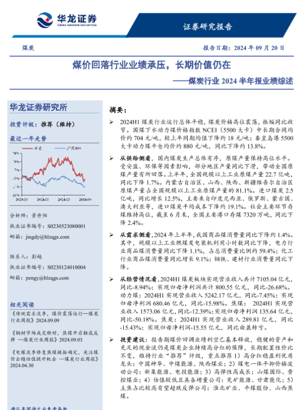 【华龙证券】【20240920】煤炭行业2024半年报业绩综述:煤价回落行业业绩承压,长期价值仍在-18页 行业研究