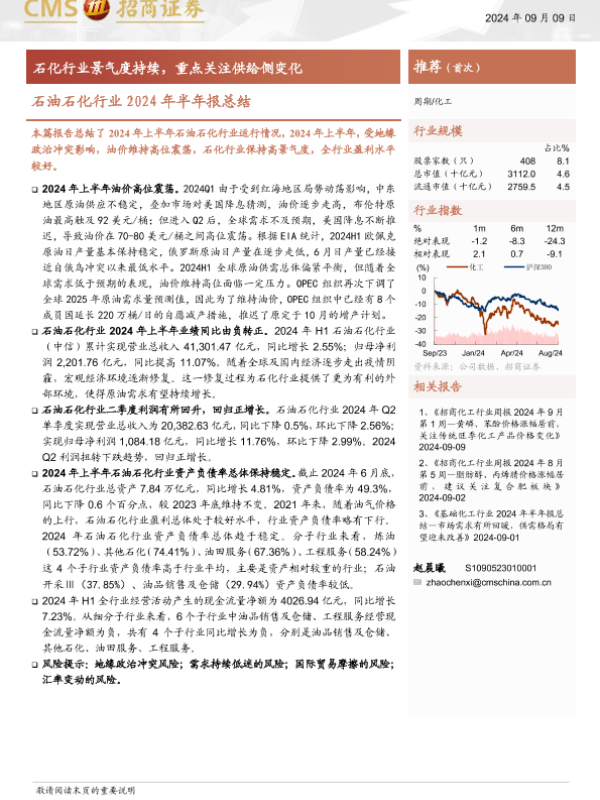【海通证券】【20240909】石油石化行业2024年半年报总结:石化行业景气度持续,重点关注供给侧变化-15页 行业研究