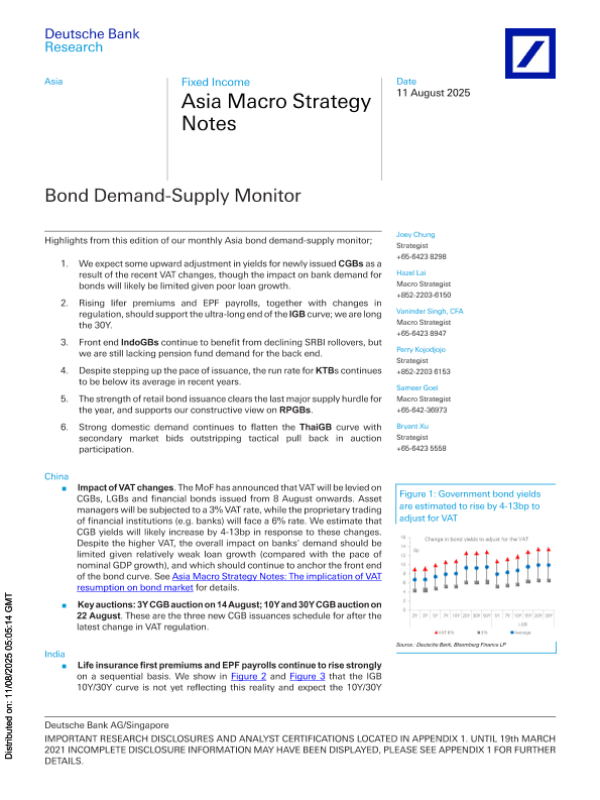 【Deutsche Bank AG】【202508】Asia Macro Strategy Notes Bond Demand-Supply Monitor-20页 证券期货研究报告