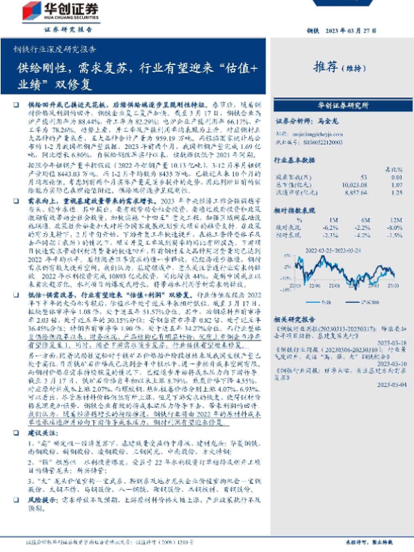 【华创证券】【20230327】钢铁行业深度研究报告:供给刚性,需求复苏,行业有望迎来“估值+业绩”双修复-29页 行业研究