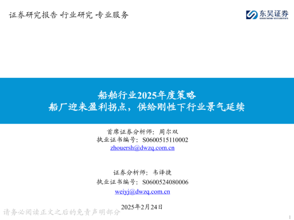 【东吴证券】【20250224】船舶行业2025年度策略:港口迎来盈利拐点,供给刚性下行业景气延续-35页 行业研究