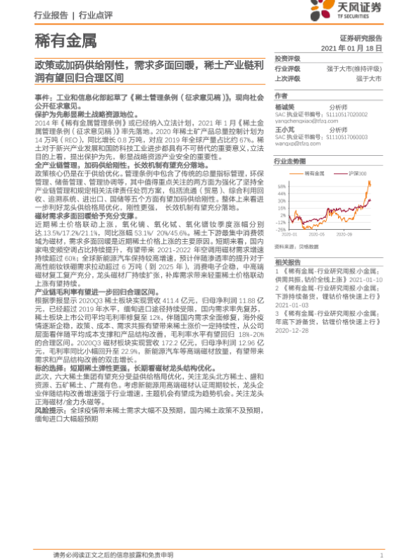 【天风证券】【20210118】稀有金属行业点评:政策或加码供给刚性,需求多面回暖,稀土产业链利润有望回归合理区间-2页 行业研究