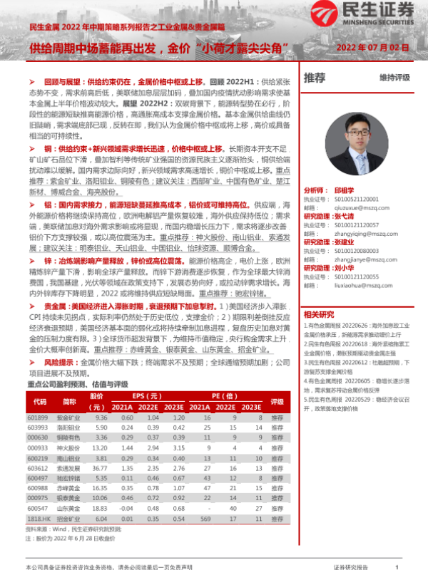 【民生证券】【20220702】金属行业2022年中期策略系列报告之工业金属&贵金属篇:供给周期中场蓄能再出发,金价“小荷才露尖尖角”-79页 行业研究