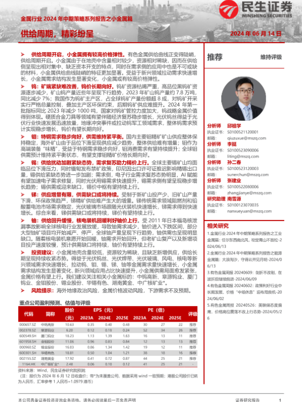 【民生证券】【20240614】金属行业2024年中期策略系列报告之小金属篇:供给周期,精彩纷呈-68页 行业研究