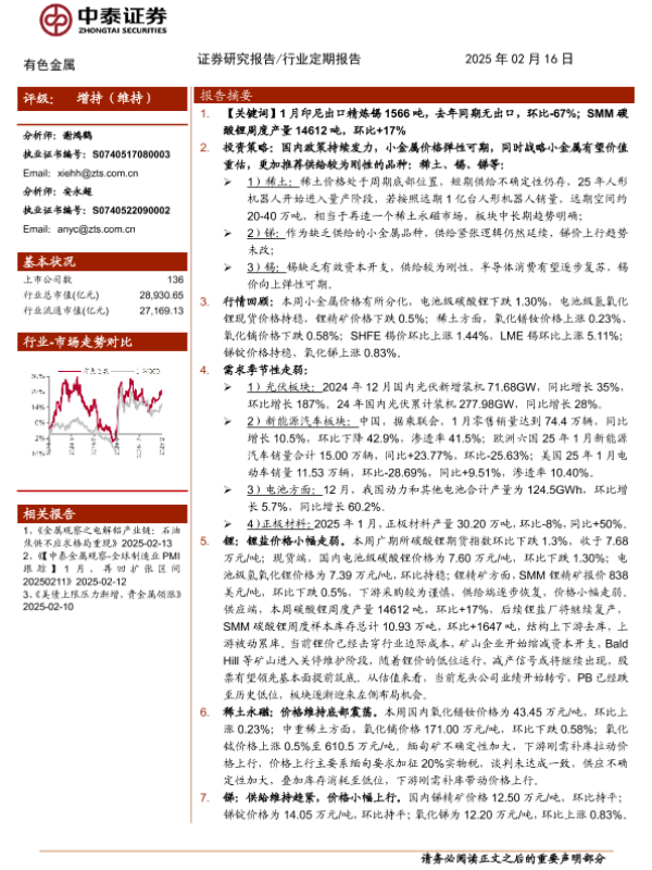 【中泰证券】【20250216】有色金属行业:供给恢复,锂价小幅走弱-25页 行业研究