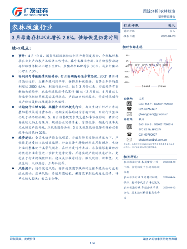 【广发证券】【20200420】农林牧渔行业跟踪分析:3月母猪存栏环比增长2.8%,供给恢复仍需时间-4页 行业研究