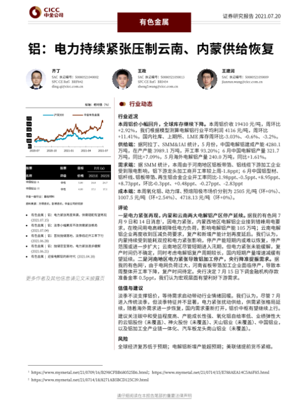 【中金公司】【20210720】有色金属行业铝:电力持续紧张压制云南、内蒙供给恢复-30页 行业研究