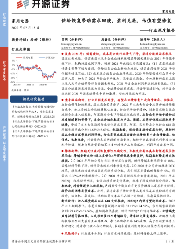 【开源证券】【20220718】供给恢复带动需求回暖,盈利见底,估值有望修复——家用电器行业深度报告-31页 行业研究