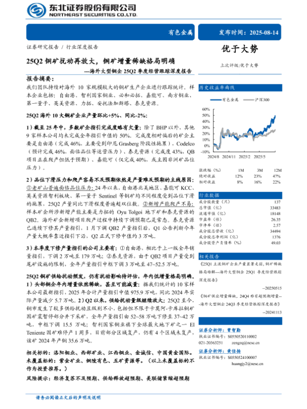【东北证券】【202508】有色金属行业海外大型铜企25Q2季度经营跟踪深度报告:25Q2铜矿扰动再放大,铜矿增量稀缺格局明确-63页 证券期货研究报告
