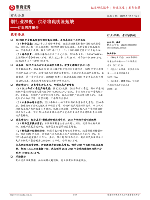 【浙商证券】【20221215】铜行业深度:供给将现明显短缺-19页 行业研究