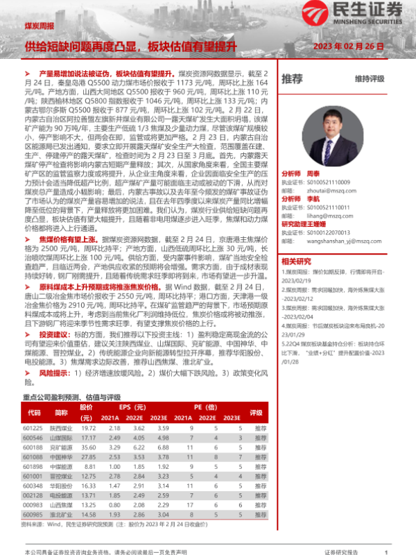 【民生证券】【20230223】煤炭周报:供给短缺问题再度凸显,板块估值有望提升-20页 行业研究