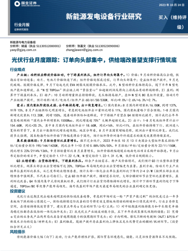 【国金证券】【20231014】光伏行业月度跟踪:订单向头部集中,供给端改善望支撑行情筑底-18页 行业研究