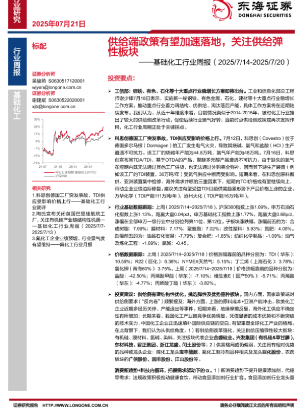 【东海证券】【20250721】基础化工行业周报:供给端政策有望加速落地,关注供给弹性板块-21页 行业研究