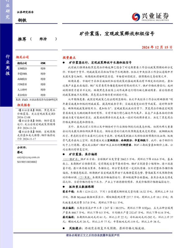 【兴业证券】【20241215】20241215-兴业证券-钢铁行业周报:矿价震荡,宏观政策释放积极信号-10页 行业研究