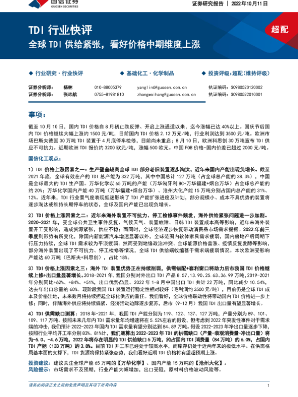 【国信证券】【20221011】基础化工:TDI行业快评-全球TDI供给紧张,看好价格中期维度上涨-13页 行业研究