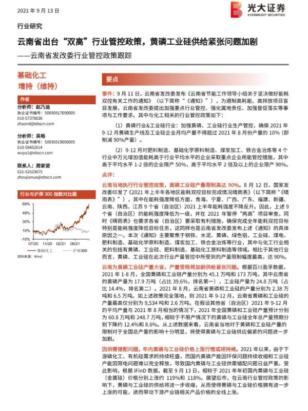 【光大证券】【20210913】云南省发改委行业管控政策跟踪:云南省出台“双高”行业管控政策,黄磷工业硅供给紧张问题加剧-3页 行业研究