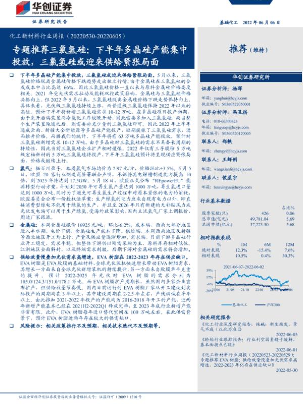 【华创证券】【20220606】20220606-华创证券-化工新材料行业周报:专题推荐三氯氢硅:下半年多晶硅产能集中投放,三氯氢硅或迎来供给紧张局面-52页 行业研究