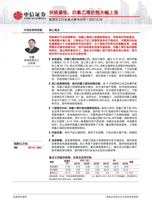 【中信证券】【20210830】供给紧张,四氯乙烯价格大幅上涨-2页 行业研究