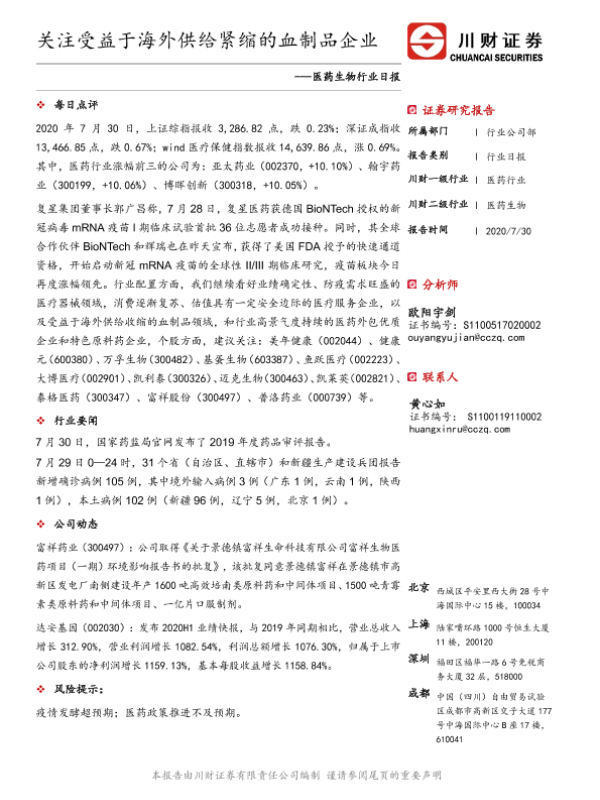 【川财证券】【20200730】医药生物行业日报:关注受益于海外供给紧缩的血制品企业-3页 证券期货研究报告