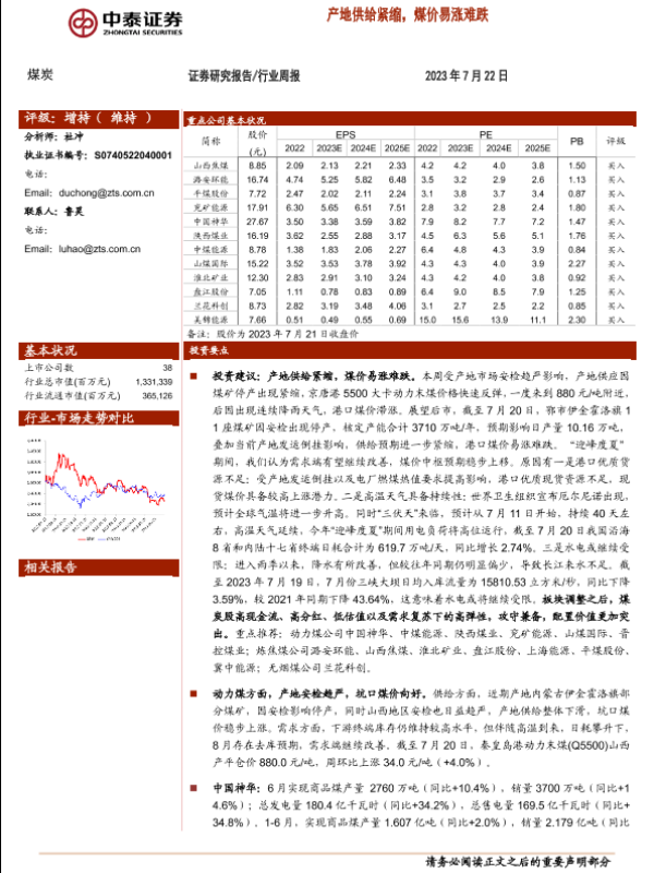 【中泰证券】【20230722】中泰证券-煤炭行业周报:产地供给紧缩,煤价易涨难跌-25页 行业研究