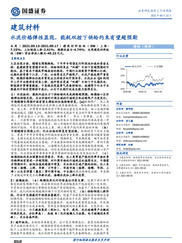 【国盛证券】【20210922】建筑材料行业周报:水泥价格弹性显现,能耗双控下供给约束有望超预期-13页 行业研究