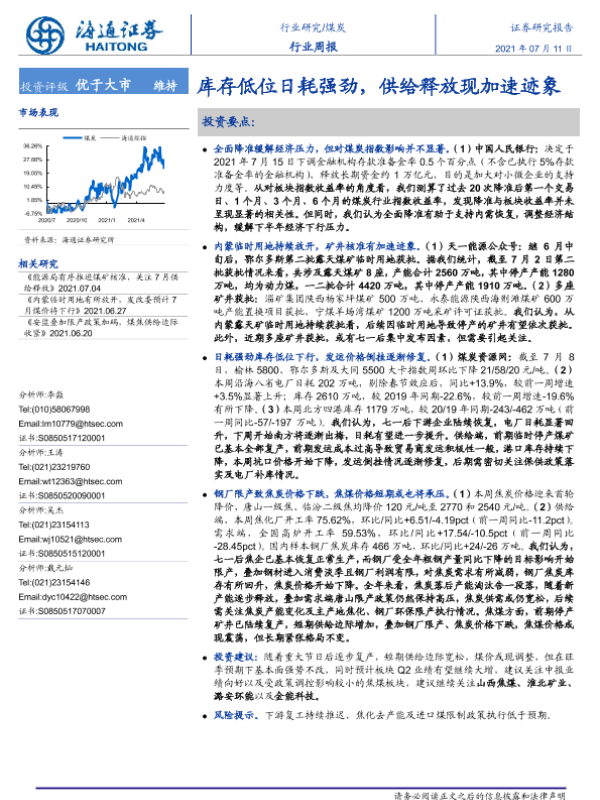 【海通证券】【20210711】20210711-海通证券-煤炭行业周报:库存低位日耗强劲,供给释放现加速迹象-2页 行业研究