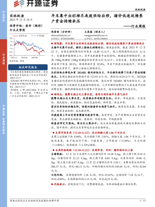 【开源证券】【20231224】20231224-开源证券-农林牧渔行业周报:年末集中出栏难尽或致供给后移,猪价低迷延续养户资金持续承压-13页 行业研究
