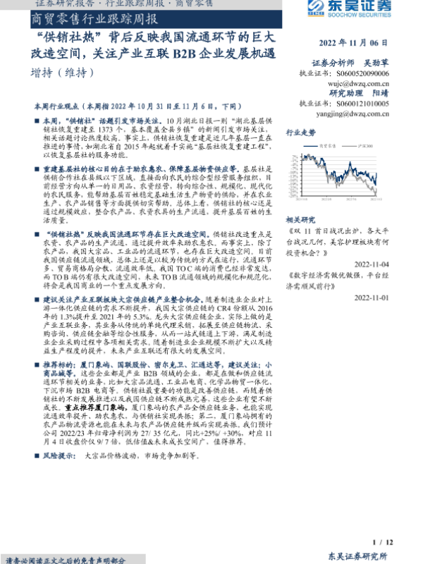 【东吴证券】【20221106】商贸零售行业跟踪周报:“供销社热”背后反映我国流通环节的巨大改造空间,关注产业互联B2B企业发展机遇-12页 行业研究