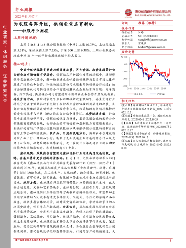 【东亚前海证券】【20221107】社服行业周报:为农服务再升级,供销社重启育新机-27页 行业研究