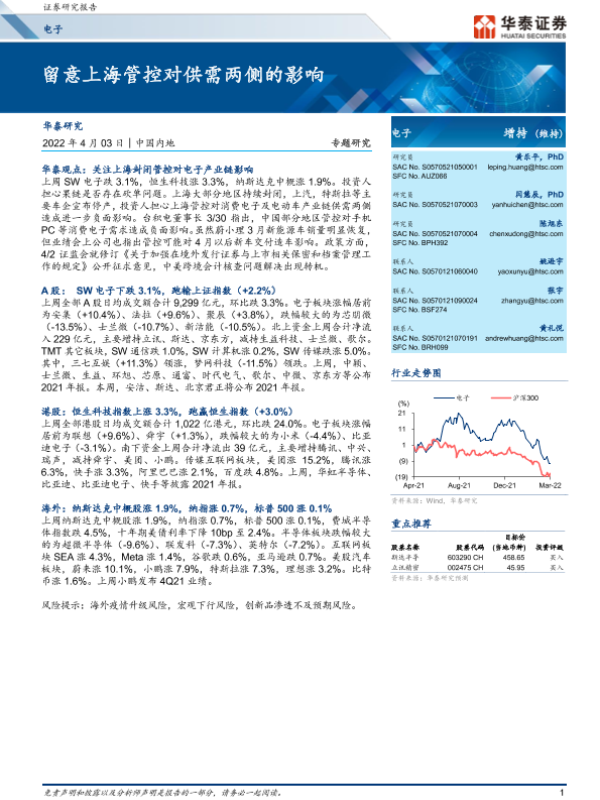 【华泰证券】【20220403】电子专题研究:留意上海管控对供需两侧的影响-18页 行业研究