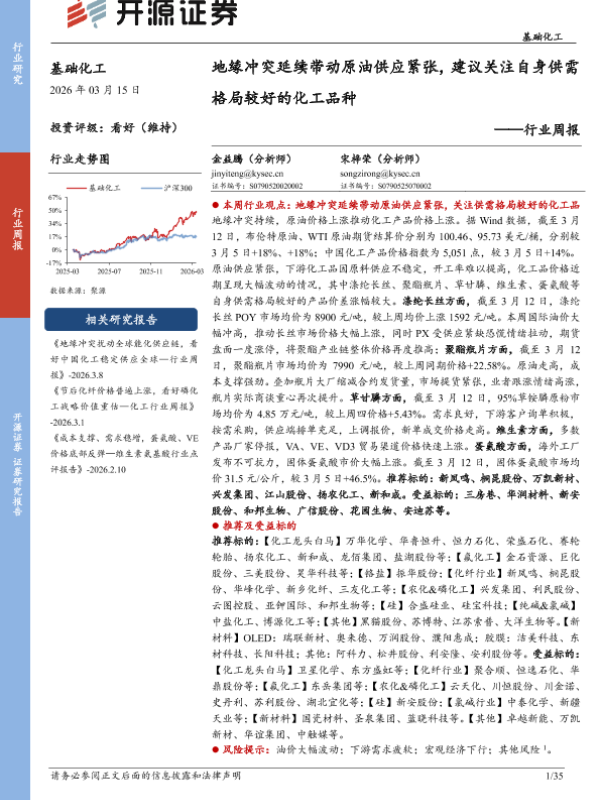 【开源证券】【202603】基础化工行业周报:地缘冲突延续带动原油供应紧张,建议关注自身供需格局较好的化工品种-35页 证券期货研究报告