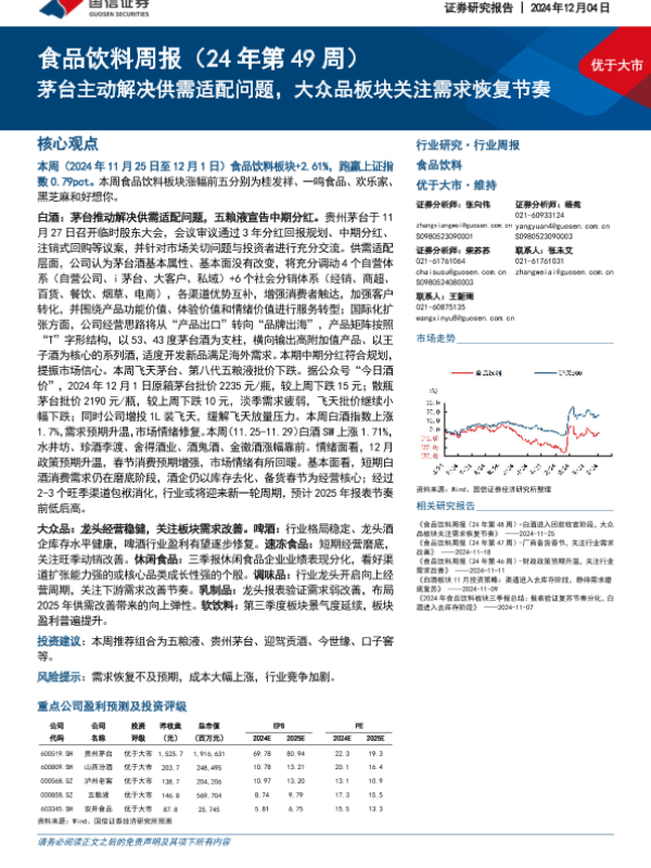 【国信证券】【20241204】20241204-国信证券-食品饮料行业周报(24年第49周):茅台主动解决供需适配问题,大众品板块关注需求恢复节奏-16页 行业研究