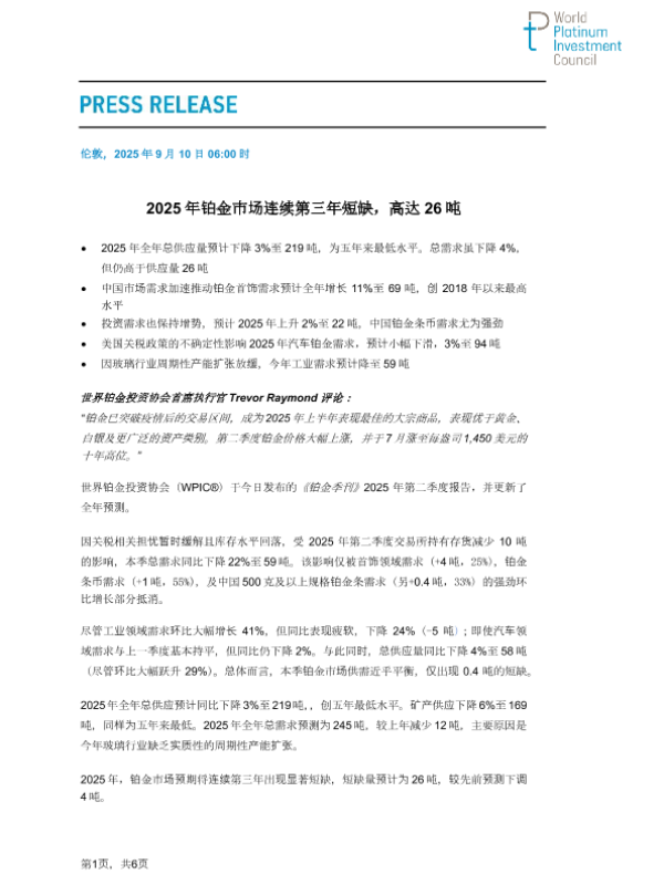 【世界铂金投资协会】【20250910】2025年铂金市场连续第三年短缺,高达26吨-6页 行业研究