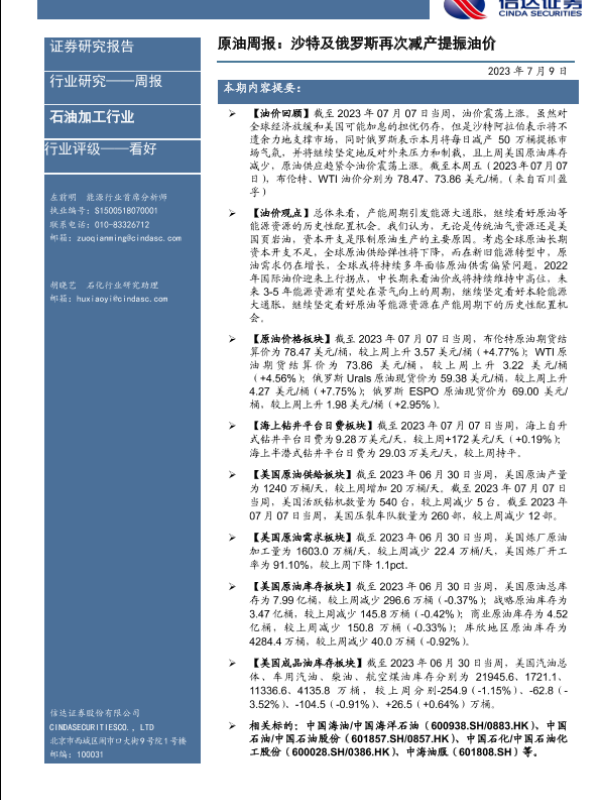 【信达证券】【20230709】原油周报:沙特及俄罗斯再次减产提振油价-27页 行业研究