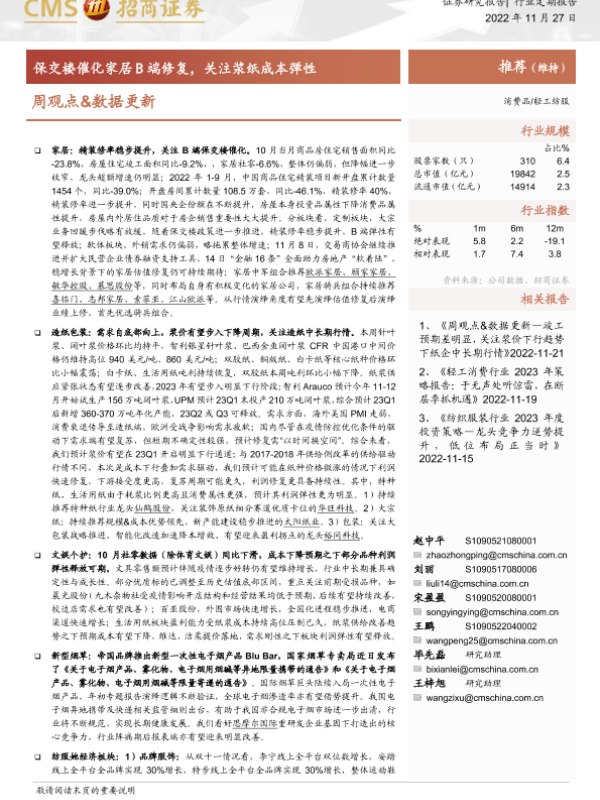 【海通证券】【20221127】轻工纺服周观点&数据更新:保交楼催化家居B端修复,关注浆纸成本弹性-20页 证券期货研究报告