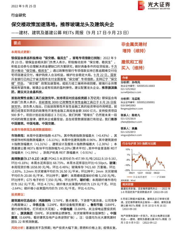 【光大证券】【20220925】建材、建筑及基建行业公募REITs周报:保交楼政策加速落地,推荐玻璃龙头及建筑央企-21页 行业研究