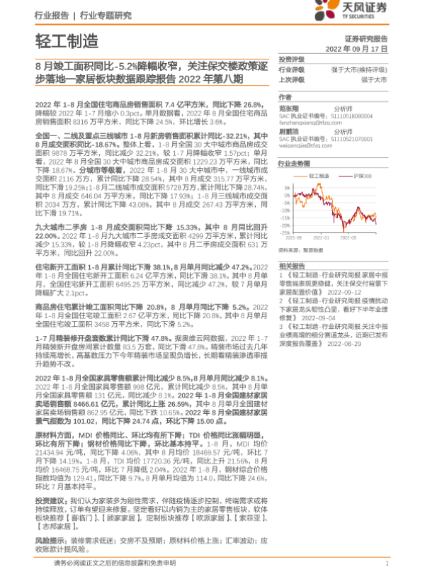 【天风证券】【20220917】家居板块数据跟踪报告2022年第八期:8月竣工面积同比-5.2%降幅收窄,关注保交楼政策逐步落地-14页 行业研究