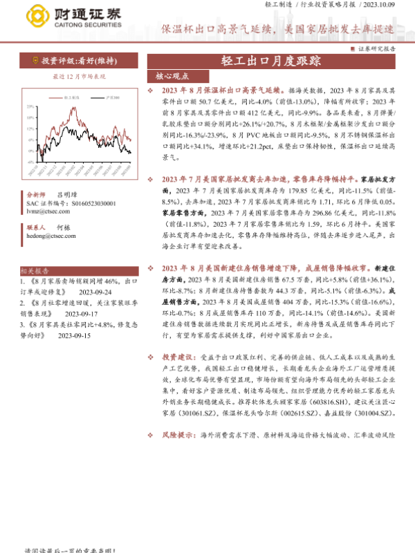 【财通证券】【20231009】轻工制造行业投资策略月报:轻工出口月度跟踪,保温杯出口高景气延续,美国家居批发去库提速-17页 行业研究