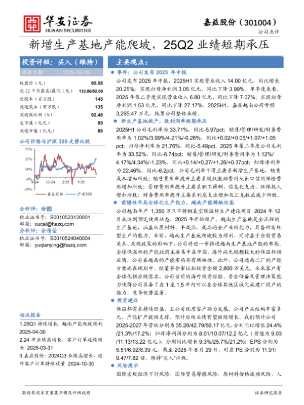 【华安证券】【20250829】嘉益股份-新增生产基地产能爬坡_25Q2业绩短期承压-4页 证券期货研究报告
