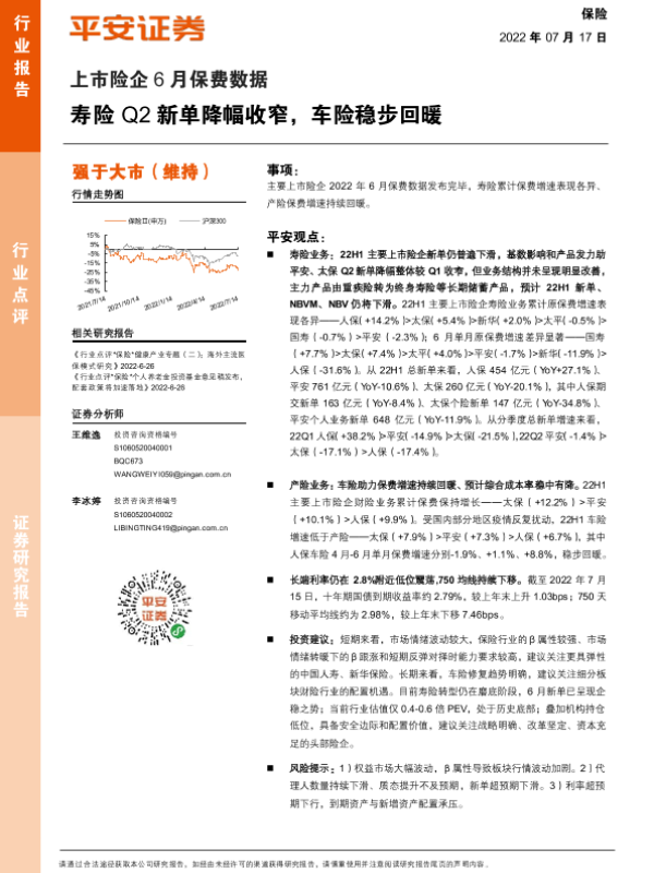 【平安证券】【20220717】上市险企6月保费数据:寿险Q2新单降幅收窄,车险稳步回暖-4页 行业研究