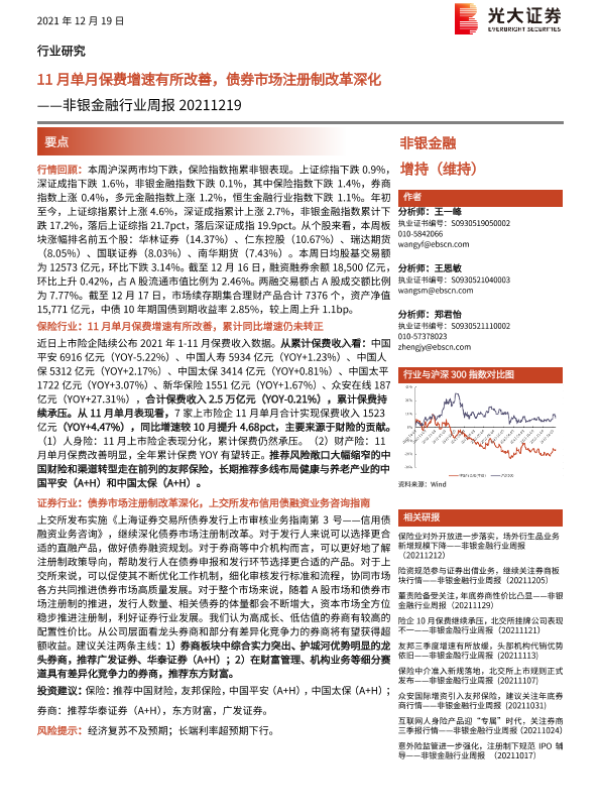 【光大证券】【20211219】11月单月保费增速有所改善,债券市场注册制改革深化-12页 行业研究
