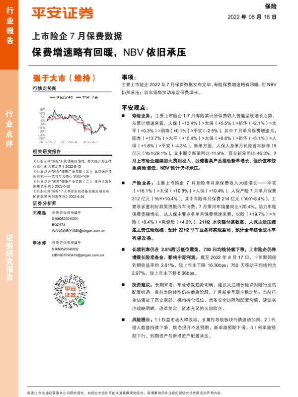 【平安证券】【20220818】上市险企7月保费数据-保费增速略有回暖,NBV依旧承压-3页 行业研究