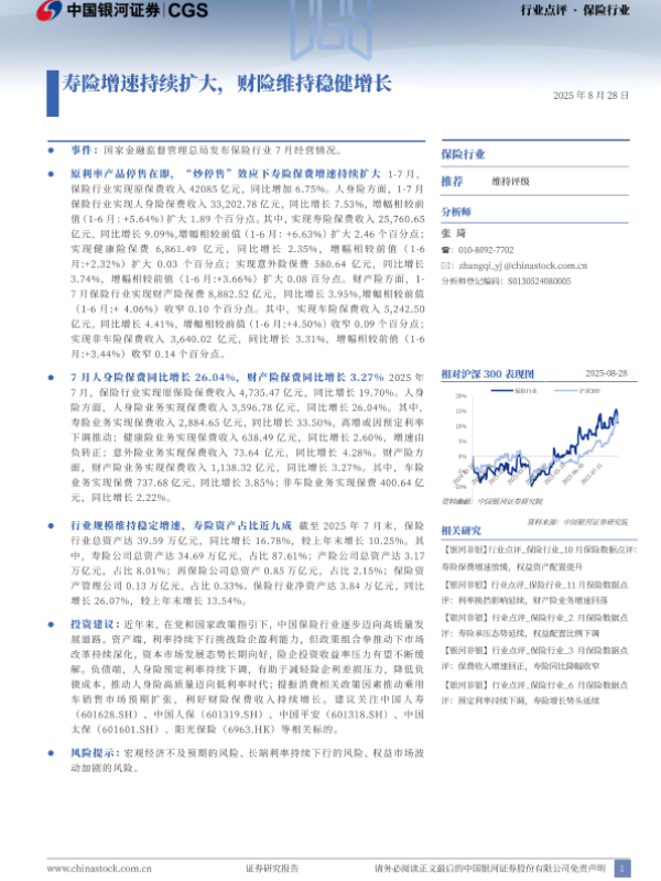 【银河证券】【20250828】保险行业-寿险增速持续扩大,财险维持稳健增长-2页 证券期货研究报告