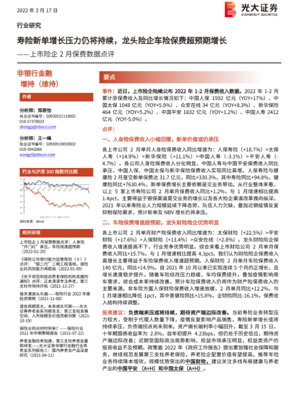 【光大证券】【20220317】上市险企2月保费数据点评-3页 行业研究