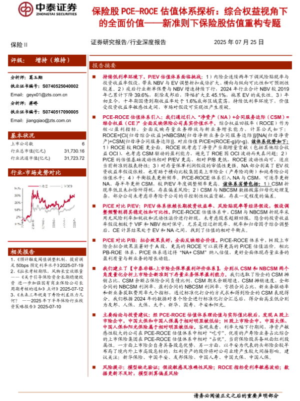 【中泰证券】【202507】保险股 PCE-ROCE估值体系探析:综合权益视角下的全面价值——新准则下保险股估值重构专题-27页 证券期货研究报告
