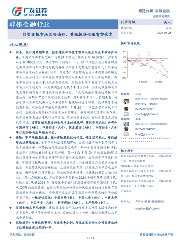 【广发证券】【20240128】非银金融行业:监管提振市场风险偏好,非银板块估值有望修复-11页 行业研究