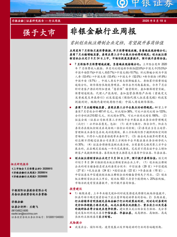 【中银证券】【20200818】非银金融行业周报:首批创业板注册制企业定档,有望提升券商估值-10页 行业研究