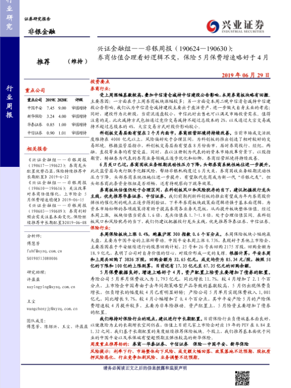 【兴业证券】【20190629】非银周报:券商估值合理看好逻辑不变,保险5月保费增速略好于4月-10页 行业研究